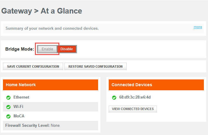 Your devices will attain a novel ip address from the router with a default gateway of Turn off and unplug the modem. What is comcast bridge mode? What is the meaning of bridge mode? This should be in the networking forums. But with any router to *disable* the bridge, you plug directly into it with manual settings and reconfigure the wan interface with the same settings, but when you get to the bridge settings dont use bridge/halfbridge. The router will restart and enter router mode. Feb 16, 2021 · turn bridge mode on and off on your wireless gatewaytypically, two pieces of equipment are required to connect to the internet and the wifi network in your home: A modem connects your home to an internet service provider's (e.g., comcast's) network. Jun 10, 2020 · yes no. Plug in the modem and turn it on. Depending on which internet service provider (isp) you use, you must do one of the following: Right click advanced > advanced setup > router/ ap / bridge / repeating mode.
